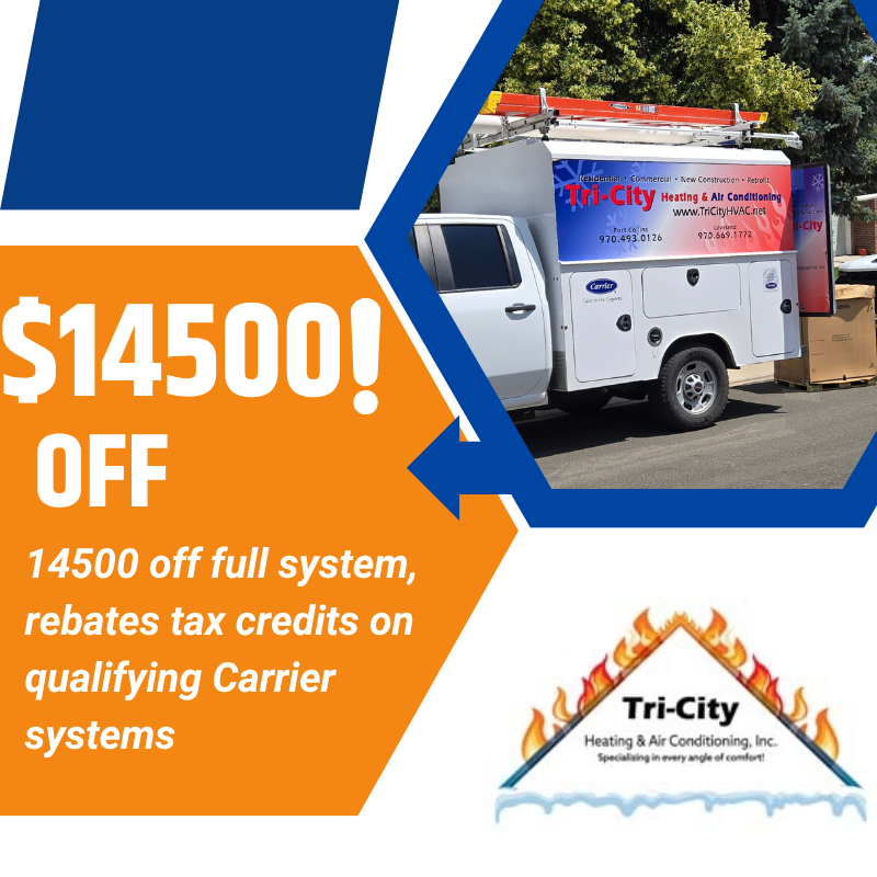 Take advantage of our incredible offer at Tri-City Heating and Air Conditioning! Get up to $14500 off a full HVAC system, plus rebates and tax credits on qualifying Carrier systems.